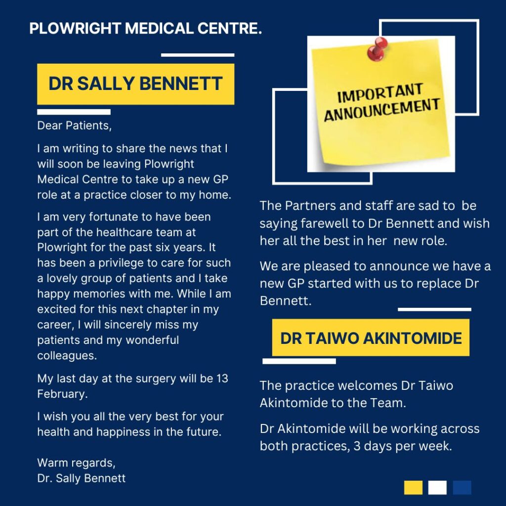 Dr Bennett will be leaving the practice on 13th February to take on a new post closer to home.